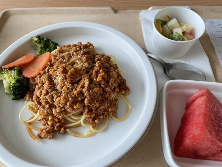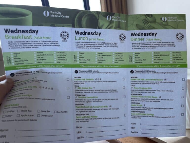 病院食は、多国籍、他宗教ならでは、写真のようにメニューが複数あり3食分選ぶ事ができます。それとは別に、3時のおやつタイムと寝る前にもクラッカーやココアなどの軽食も提供されます。子供達がお見舞いに来た時には、お菓子を追加でくれたりもしました。
