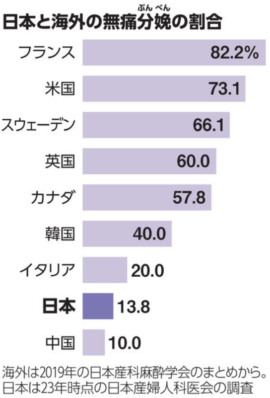 日本では、金額が高い、産院が限定される、周囲ではまだ当たり前ではない理由から、他の先進国に比べ、まだ無痛分娩率が低いようです。